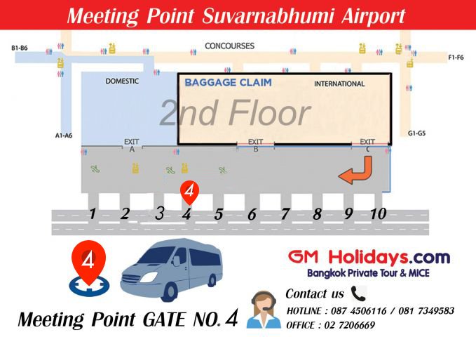 After baggage claimed, walk to arrival hall Gate No. 4 passenger will meet GM HOLIDAYS officer or Tour Guide.